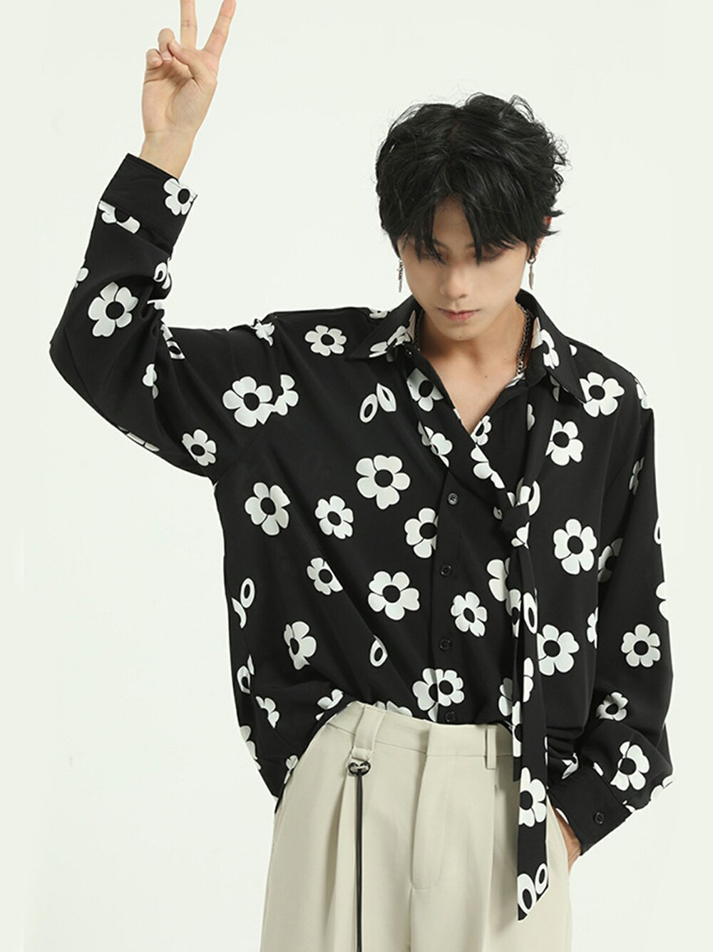 -HOOK- officialのシャツ/ブラウス「【HOOK】ヴィンテージ感 モノクロ花柄シャツ ネクタイ付き」を使ったコーディネート