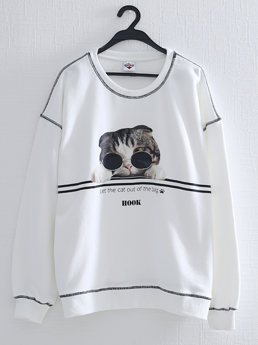 --------------------【HOOK -original-】--------------------- オリジナルプリント+カラーブロックの飾りカバーステッチ=HOOK 2020 新作トレーナー HOOKのオリジナルプリントがついに登場! momoという名前のニャンチャンを主役として、色々なシリーズのプリントを展開! たまにサングラスをかけたり、キャップをかぶったり、ヒップポップに熱中! これからも様々な活躍をお楽しみください!~ ○ 生地の伸縮性 ・・・ 多少伸縮します。 ○ 生地の透け感 ・・・ 薄いカラーは、インナーが濃色の場合やや透け感があります。 ○ 生地の厚み ・・・ 春秋冬に最適 ○ 着用のサイズ感 ・・・ オーバーサイズ ○ 裏地の有無 ・・・ 無し