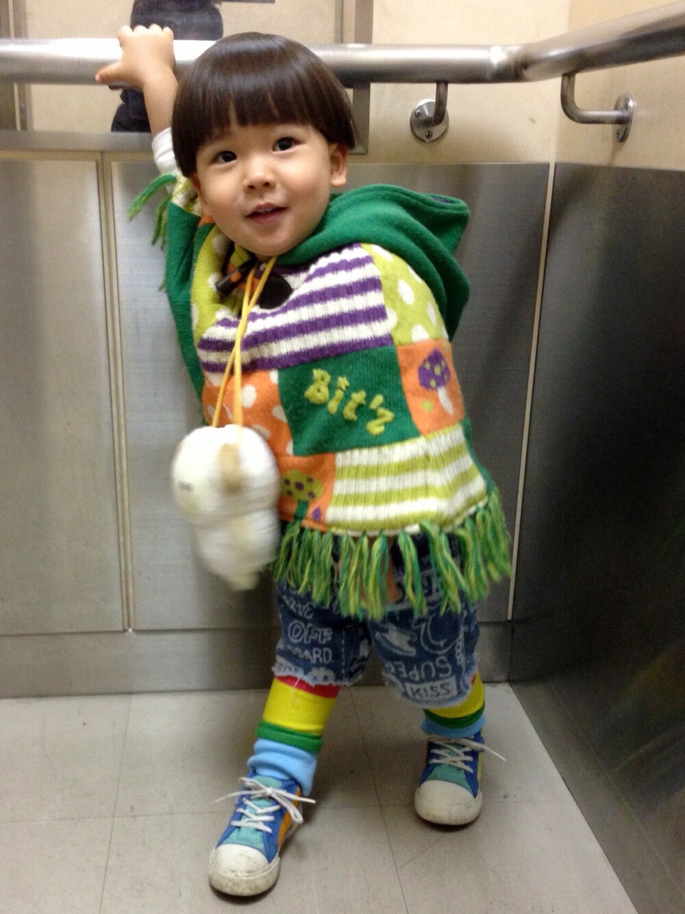 グリーン系のポンチョを着用したキッズの冬コーディネートの1枚目の写真