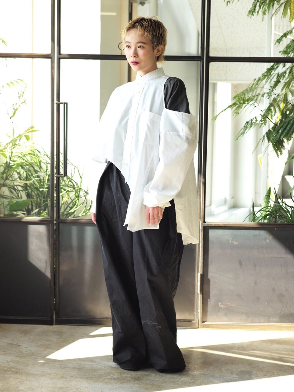 litmusで購入した 白のシャツは肩の所が空いてるから 中にミズイロンドのグレーシャツを合わせました◎