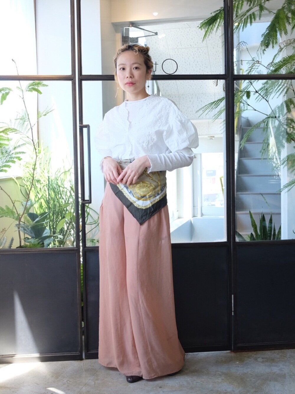 フェミニン♡ 白のブラウスに白のリブT ピンクベージュのシースルーパンツ ブラウンのパイソンパンプス 腰にカーキのストール巻き