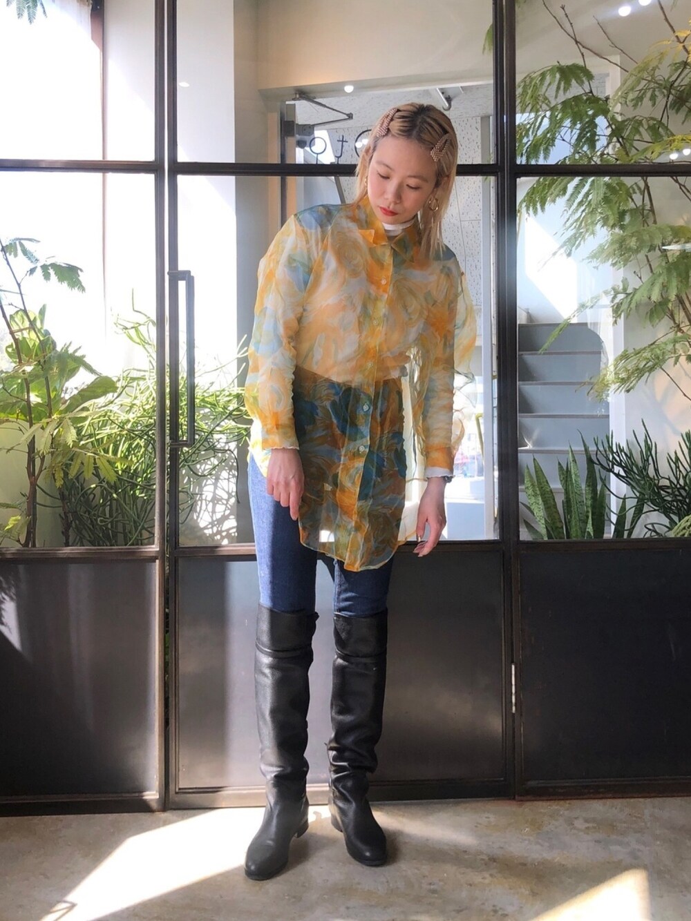 春のコーディネート🌼🌼 シースルーのシャツと ロングブーツは litmusで購入しました!!