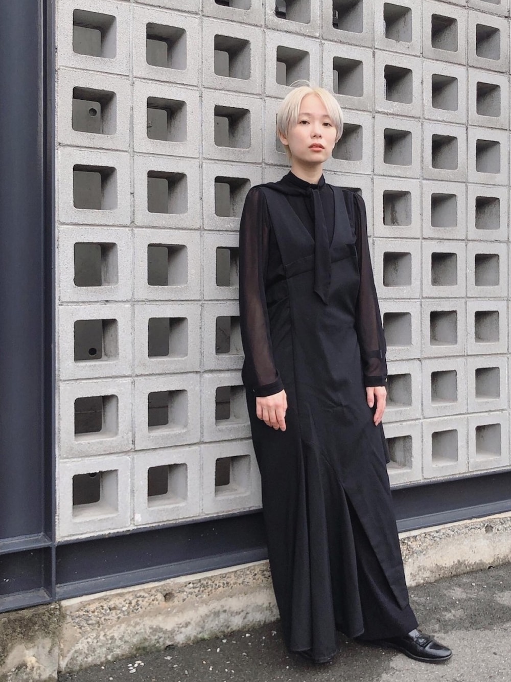 ブラック系のトップス、ブラック系のスカートを着用したレディースの冬コーディネートの1枚目の写真