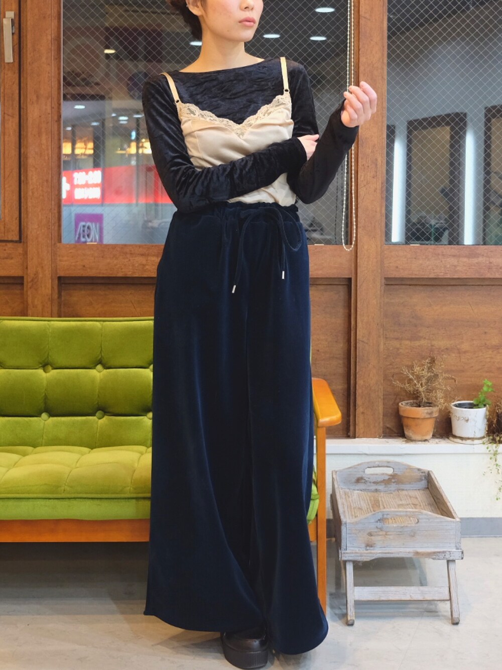 ベルベット素材のブルーのパンツは 横にスリット入ってるデザイン‼︎ トップスもベルベット素材にして キャミソールは nuttyのレースキャミ☆