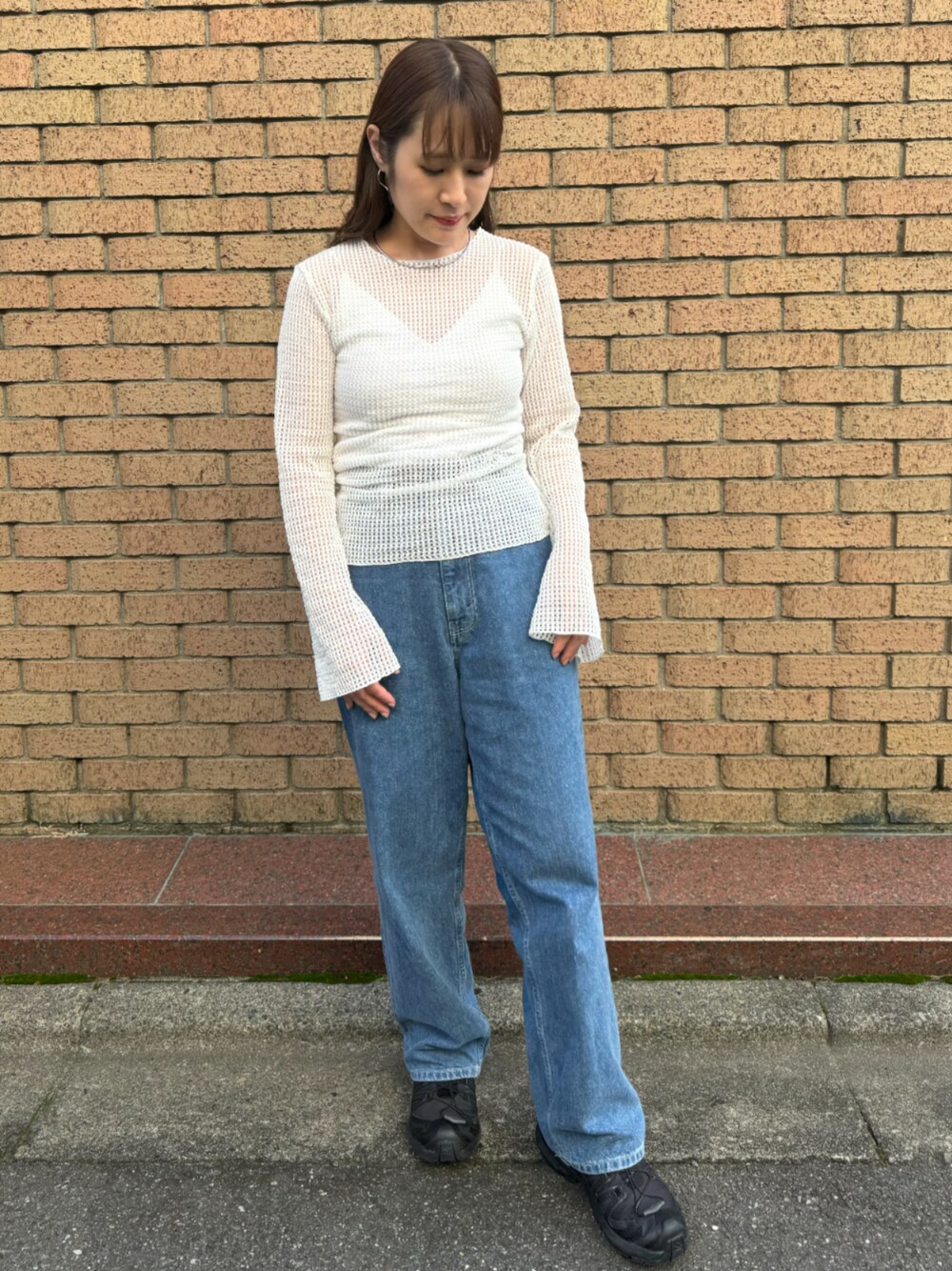 【kiehtova】のメッシュトップスを使った秋コーデ 一枚でもさまになるメッシュトップス。 ベルスリーブの袖の広がりがエレガントな印象も与えてくれます。