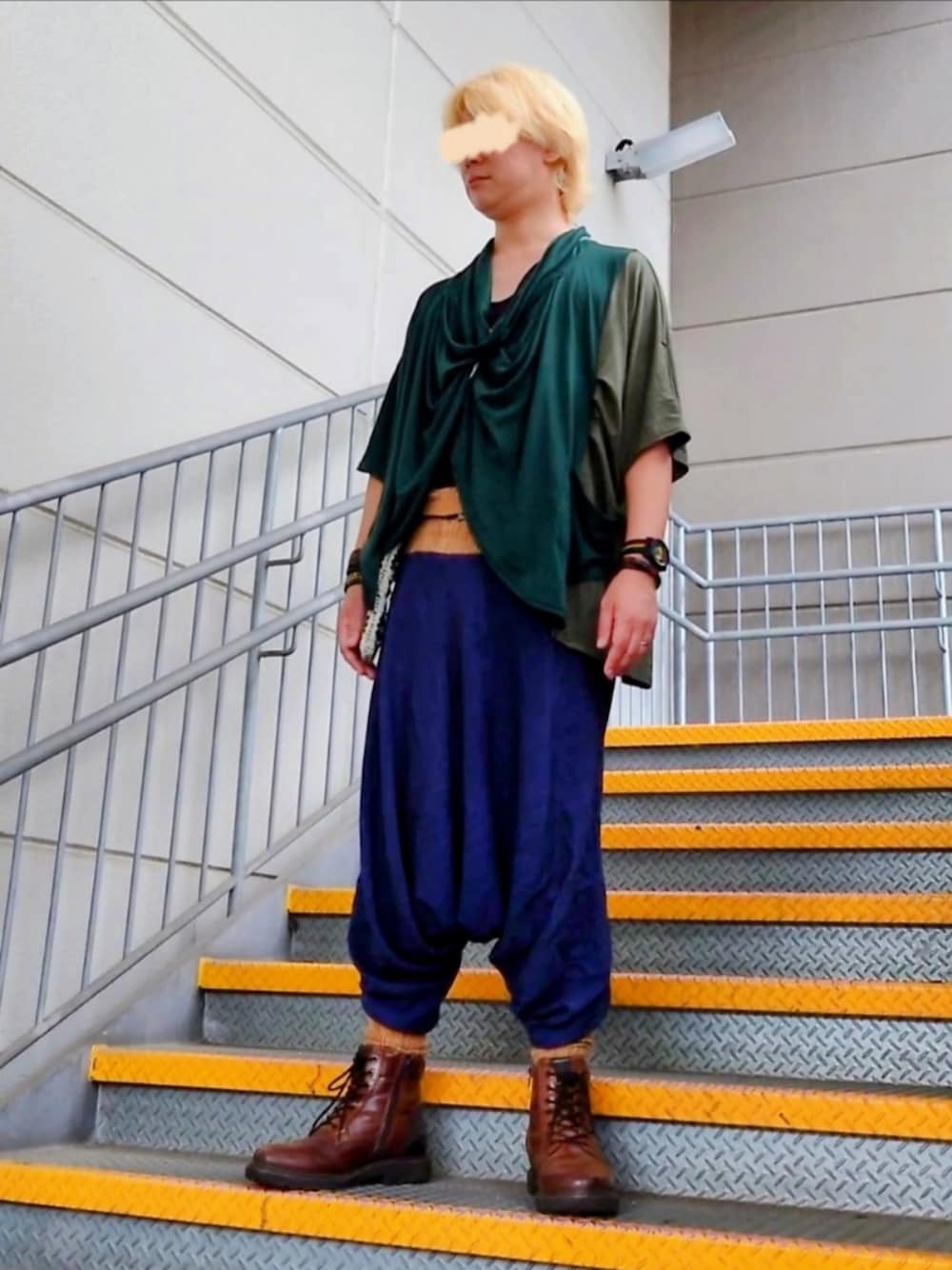 チャイハネトップスにお義母さんに頂いたサルエルパンツを合わせる。 ブルー系のカラーの使用頻度が低いからグリーンとブルーの組み合わせは割とレア