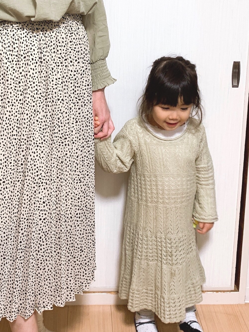 今日のコーデ❤️ 今日は2人でピスタチオカラーに✨ 春グリーン可愛い😍😍💕 偶然にも似たようなグリーンだったので、親子リンクして、合わせて✨😊 今日は風が冷たくて寒かったので、娘はインナーとパンツをニットワンピースに着込んで👗💓 もっと暖かくなったら、インナーキャミ1枚で着せたいな😆 #小窓も見てね❤️