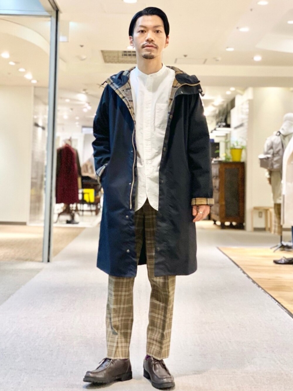 チェック✖️チェック✖️ホワイト Barbourのロングコートの裏地のチェックにパンツのチェックをリンクさせたコーディネートです。 チェックが主張できるようにトップスはシンプルなバンドカラーの白を合わせました。