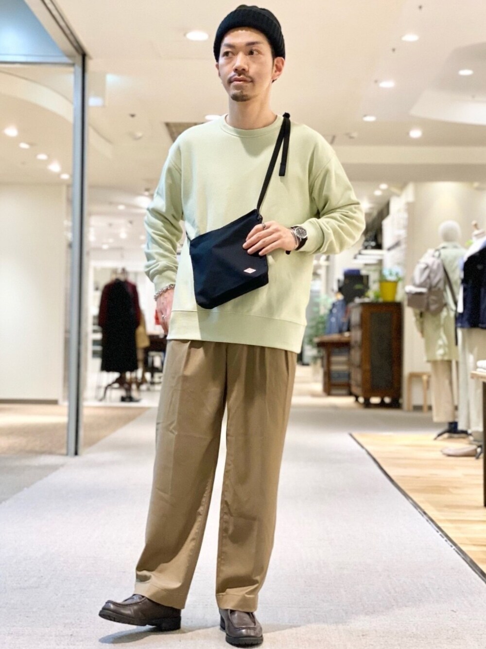 カラーはグリーン✖️ブラウン 春らしいキレイなグリーンのスウェットにWEB限定パンツを合わせました。 WEB限定パンツはレーヨン混で着心地もシルエットも良く動くと軽やかな質感で着ていただけます。 2色とも淡色トーンなのでバックを黒にして色のバランスをとりました。