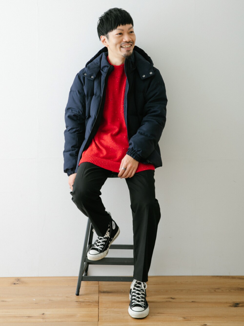 【ITEMS】 ダウンジャケットが新着で入荷! 3色ご紹介! まずはネイビー!! 今年人気のカラーニットのレッドと合わしてパンツはスラックスでキレイめで合わせました。