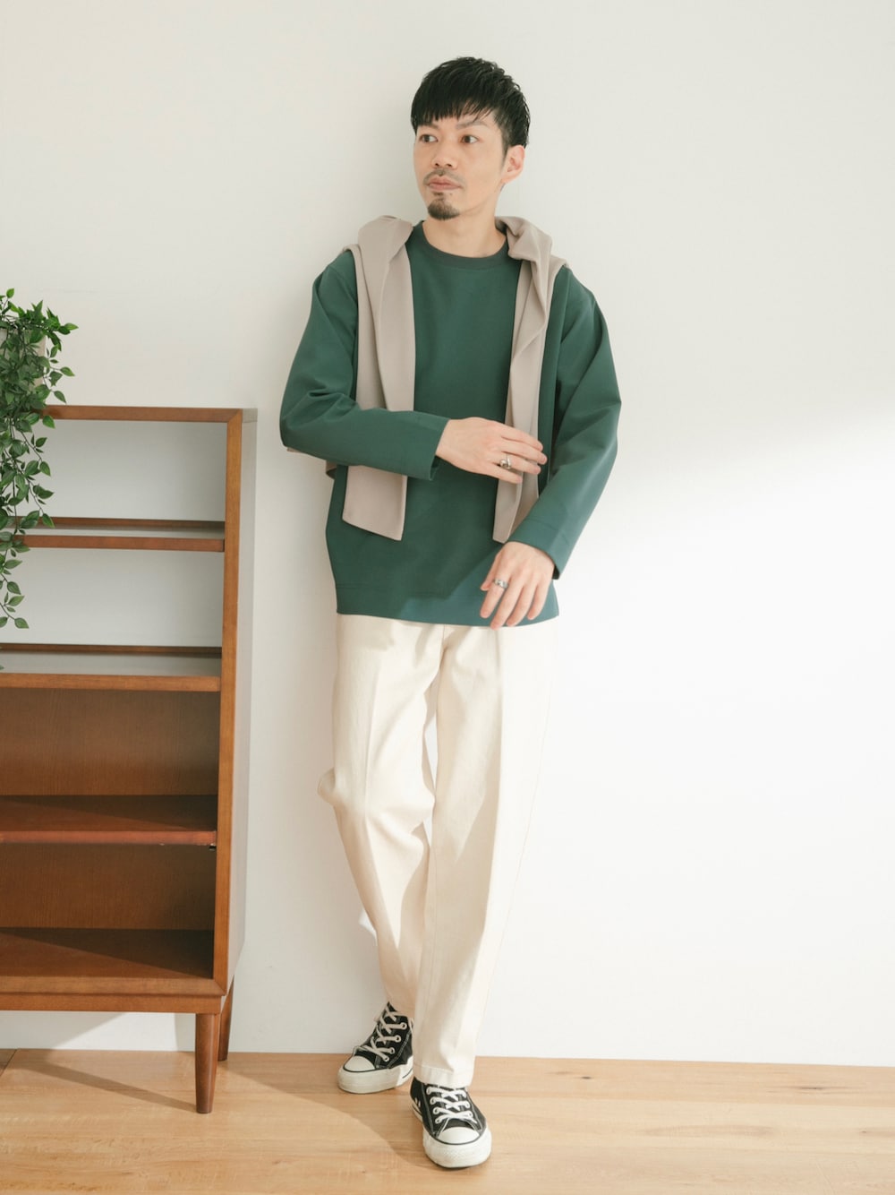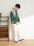 【ITEMS】 グリーンの機能性ロンTトップスを今回シンプルにホワイトと合わせました。 カーディガンを肩にかけて雰囲気出しでコーディネート!