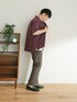 【ITEMS】 パープルとそれに近いカラーのスラックスで合わせて白のインナーで明るさを出してコーディネートしました。