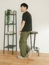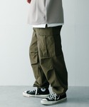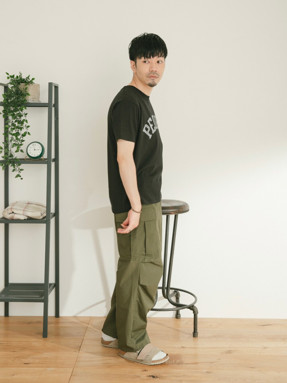 【ITEMS】 新作のロゴTシャツに人気のファティーグパンツを合わせました。 グリーンとブラックで格好良く! ワイドではないシンプルサイズのTシャツにワイドパンツを合わせて存在感アップ!