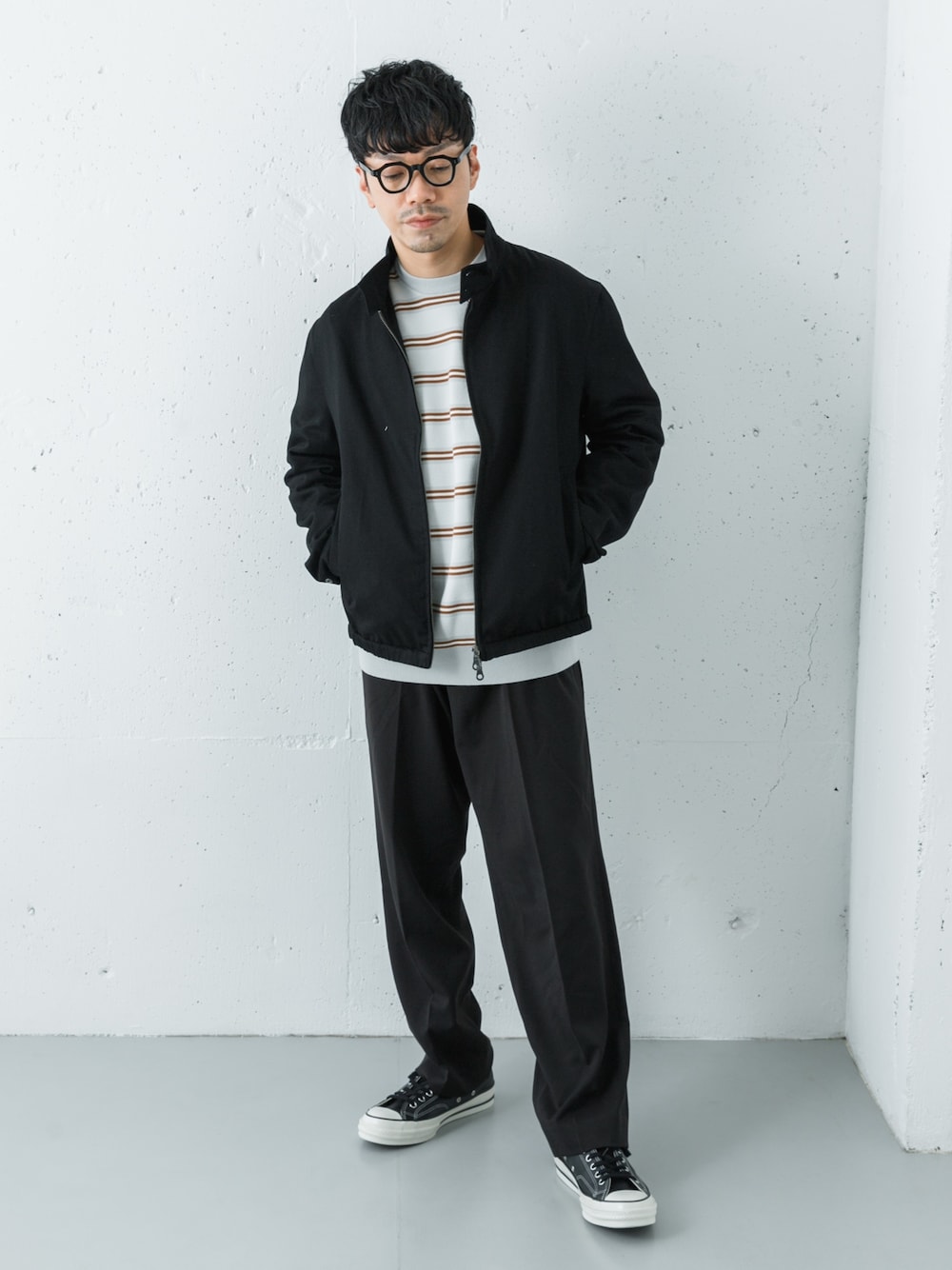 デニムブルゾンに同系色のカジュアルスラックスを合わして、柄ニットをアクセントにスッキリ見えのカジュアルスタイルにしました。レザースニーカーで上品さもアップ◎ カラーはオールブラックで格好印象に柄ニットを挟むことで暗くなりすぎず遊び心のある印象にしました。 アウターはデニム素材のスタンドブルゾンで、スタンダードでやや細身のすっきりシルエット。 春ニットを着て丁度良いサイズ感です。 ニットは機能性豊富な春ニット。 サイズ感は程よくゆとりがありながらワイドに見えない丁度良いシルエットです。 パンツも機能性豊富のオススメパンツです! 2タックで太さのあるスラックスでカジュアルな服装に組合せばオシャレな雰囲気に早変わりです◎ ーーーーーーーーーー サイズ感・・・ベーシック スタイル・・・カジュアル 色合わせ・・・2トーン ーーーーーーーーーー