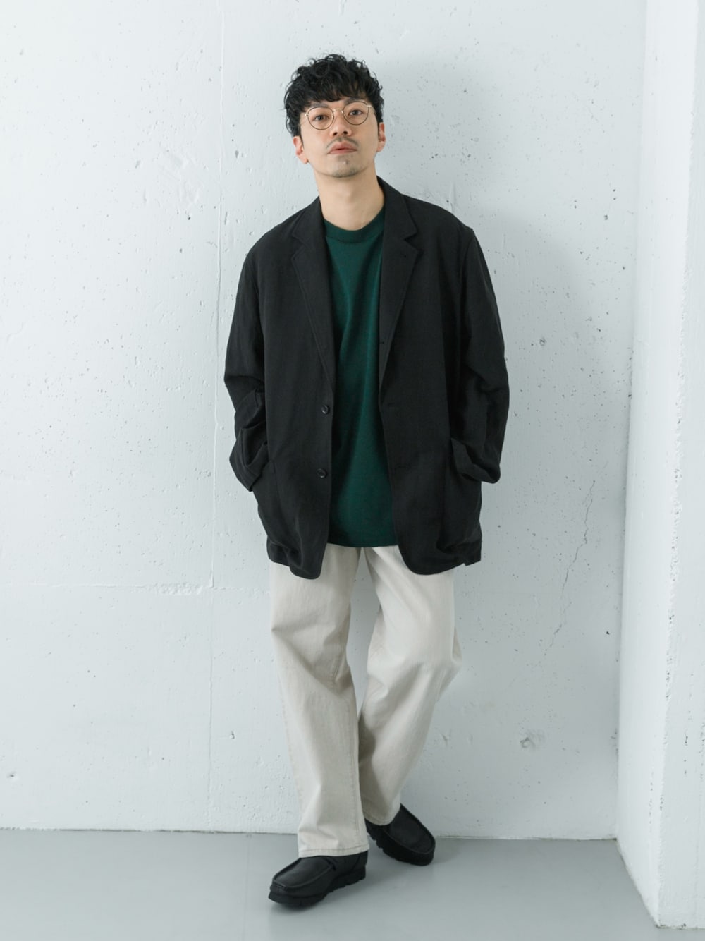 上質なシルクとリネンで出来たジャケットに明るめのデニムとカラーTシャツを合わせた大人のカジュアルスタイル。 カラーはブラックとホワイト系のベーシックでモノトーンにしてグリーンポイントにオシャレな印象にしました。 ジャケットはMサイズで余裕のあるワイドなシルエットです。 一年中着られる絶妙な素材感でシルクの柔らかさとリネンの涼しさが足された上品さに加えて通気性もあるので着心地と良いです。 TシャツはLサイズでややワイドなサイズ感です。 脇が特徴的で普通にしてればシンプルTですが動くと雰囲気が出るデザインです◎ パンツはMサイズでややワイドシルエット。 ゆったりめなスタイルにマッチします。 ーーーーーーーーーー サイズ感・・・ワイド スタイル・・・きれいめカジュアル 色合わせ・・・3トーン ーーーーーーーーーー