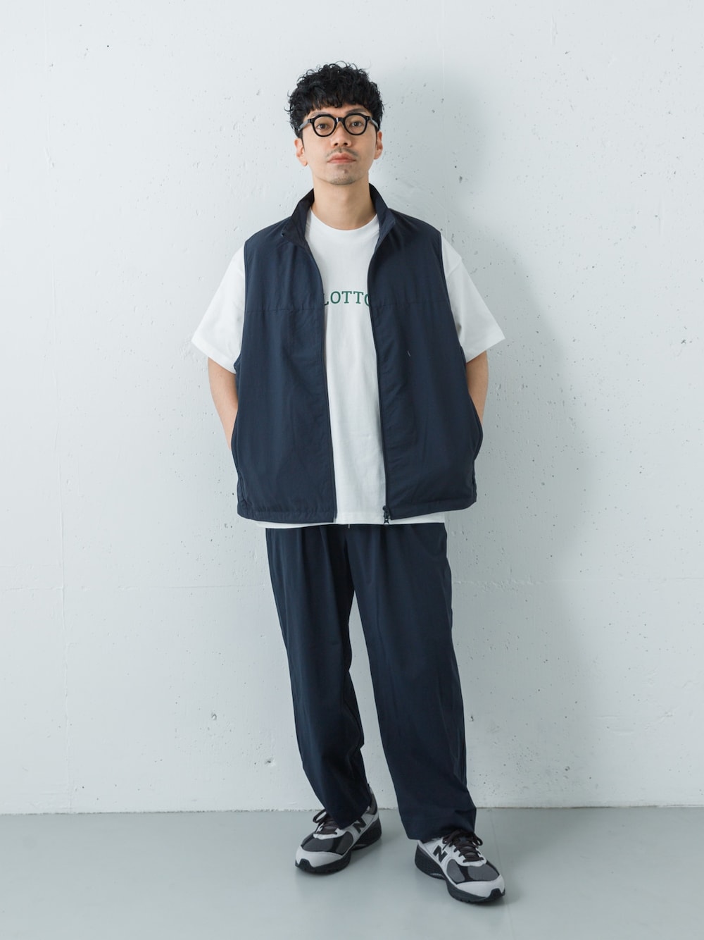 【WideDad×LOTTO】 Wide DadのベストとイージーパンツにLOTTOのTシャツを合わせたレイヤードコーデ。 カラーはネイビーとホワイトでまとめてLOTTOの緑のロゴをさりげなくポイントに。 スニーカーも全体と合う配色にしました。 ベストは2のサイズで身幅はややゆとりがあって着丈は少し長めです。 薄くてハリのあるナイロン素材でこれからの季節大活躍です◎ パンツは1のサイズで幅は広めですが裾に向かってややテーパードになってるのでスッキリ見えします。 とにかく楽で涼しくてストレスのないパンツです◎ TシャツはMでピッタリすぎず程よくゆとりのあるスタンダードなシルエットです。 ーーーーーーーーーー サイズ感・・・ややワイド スタイル・・・カジュアル 色合わせ・・・2トーン ーーーーーーーーーー