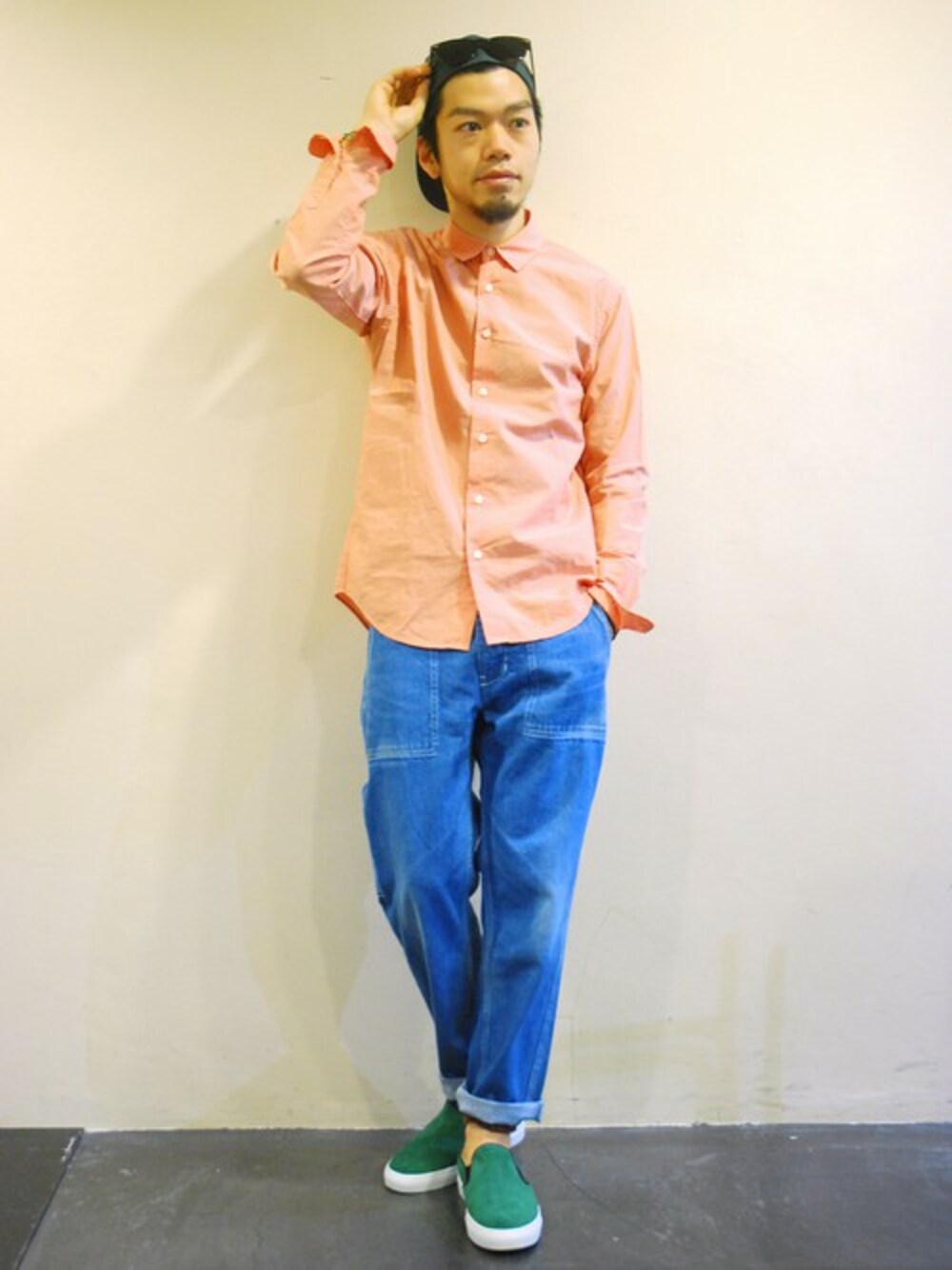 綺麗なオレンジのシャツがポイントのコーディネートです。