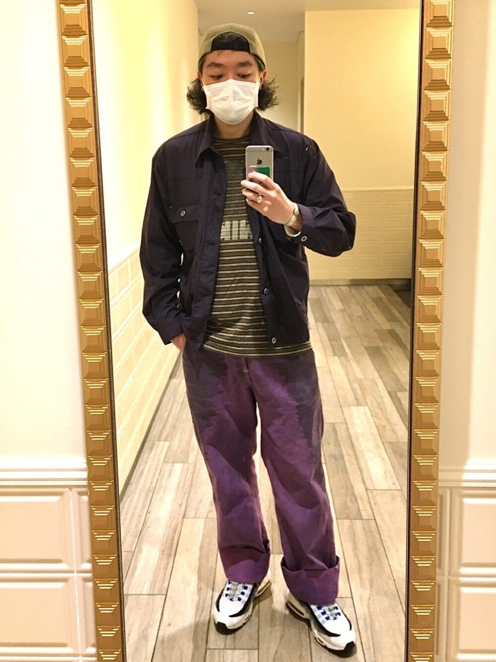 パープル系のデニムパンツを着用したメンズの春コーディネートの1枚目の写真