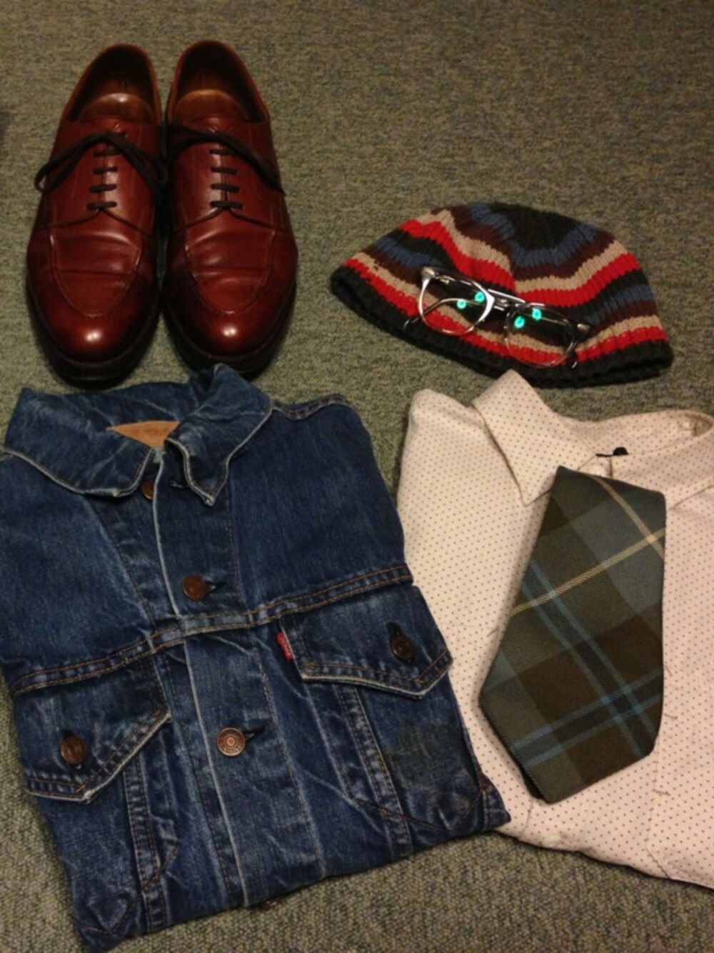着用アイテムの登録とかあまり意味分からないですが、リーバイスは60'sの70505、Big Eです。 クロケット&ジョーンズやインバーアランのニットキャップ、RRLのカバーオールのシャツとタイで黒人さん風なアイビーって感じで。 眼鏡は50'sアメリカンオプティカル。
