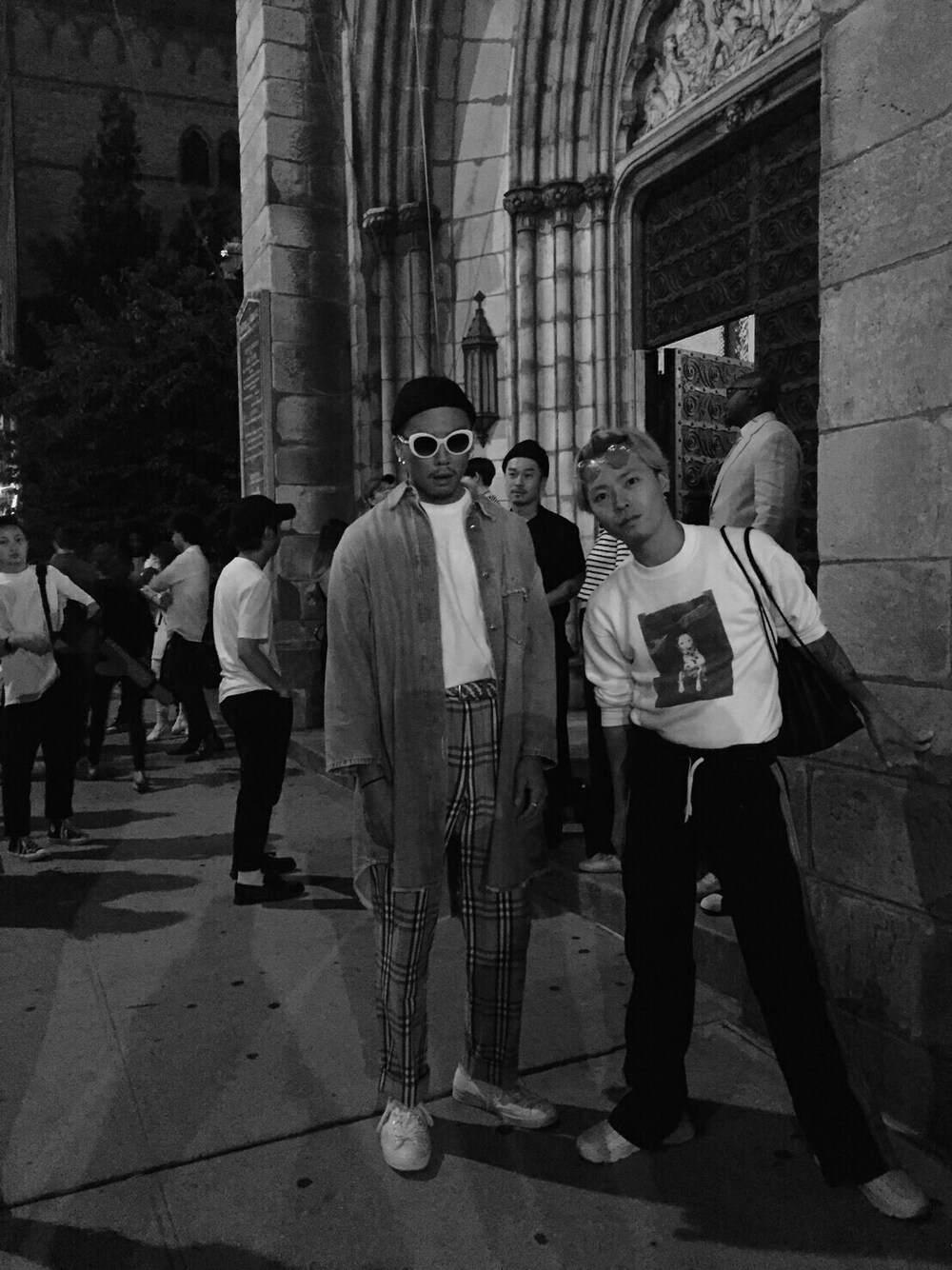 Ikumiのファッションショーの後に。 Outer : MM6 Inner : Supreme Hanes Pants : Burberry Shoes : Converse x Comme des Garcons Accessories: Beton Cires, Prada, Comme ca ism