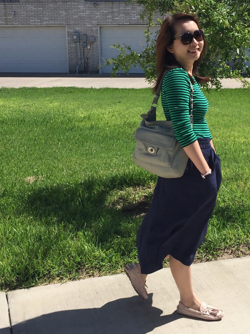 Casual midi skirt with stripe top and loafer welcome the spring time