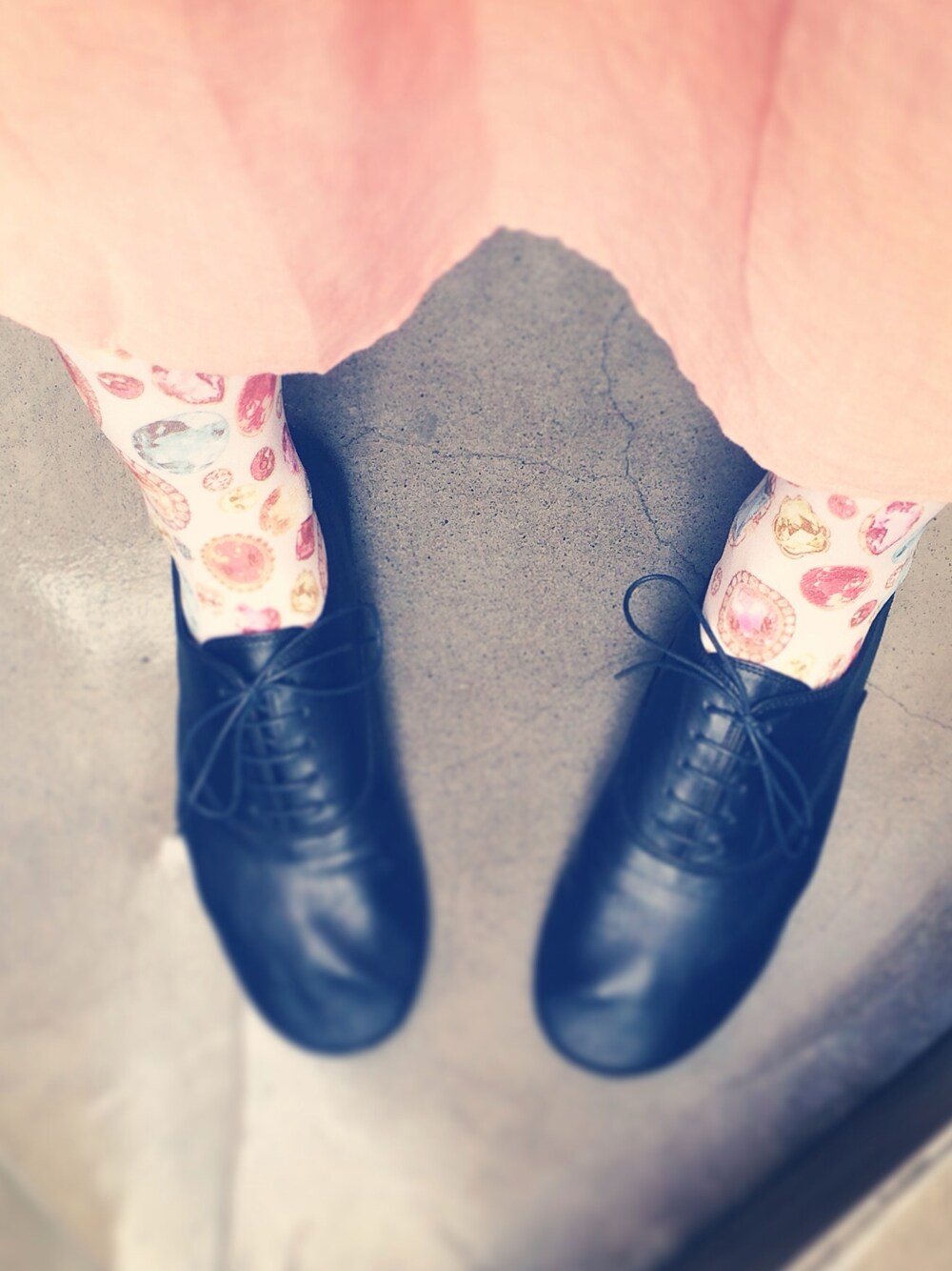 ピンクのロング丈ワンピースからちらりと見えるビジュー柄のタイツがお気に入りのコーデです♡