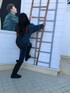 ブラック系のブーツ、グリーン系のニット/セーター、ブラック系のボディバッグ/ウエストポーチを着用したレディースの春コーディネートの2枚目の写真
