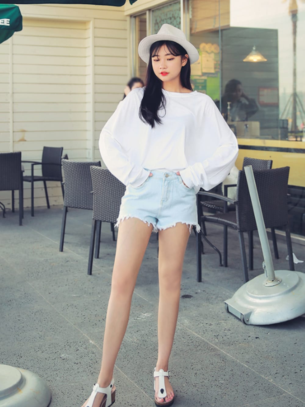 HOTPINGのデニムパンツ「ラウンドカッティングダメージデニムショートパンツ」を使ったコーディネート