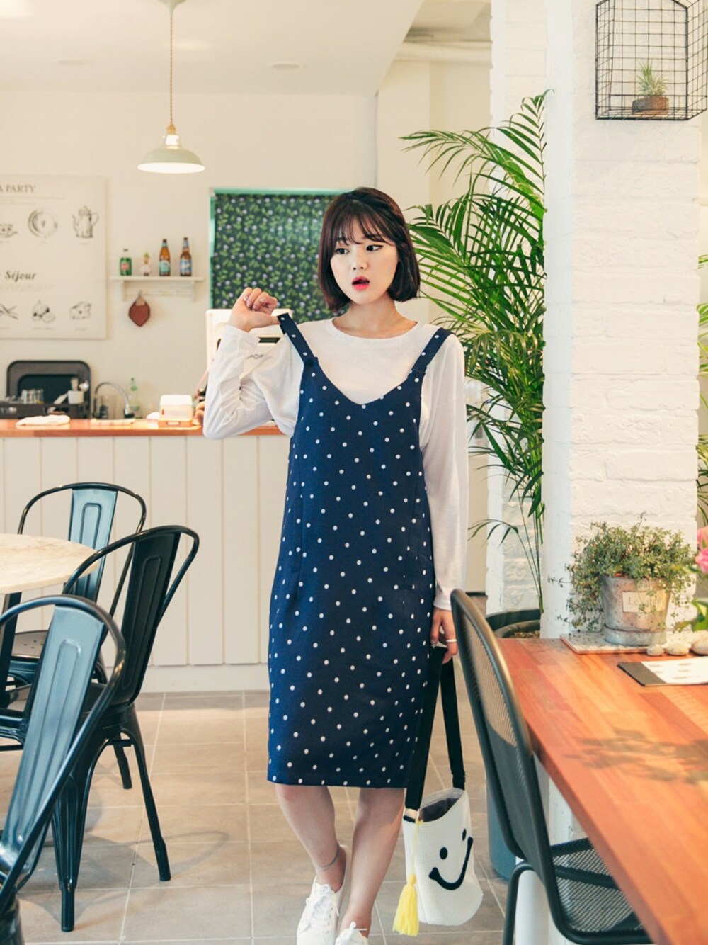 HOTPINGのワンピース「ひざ丈ドットパターンサロペットスカート」を使ったコーディネート