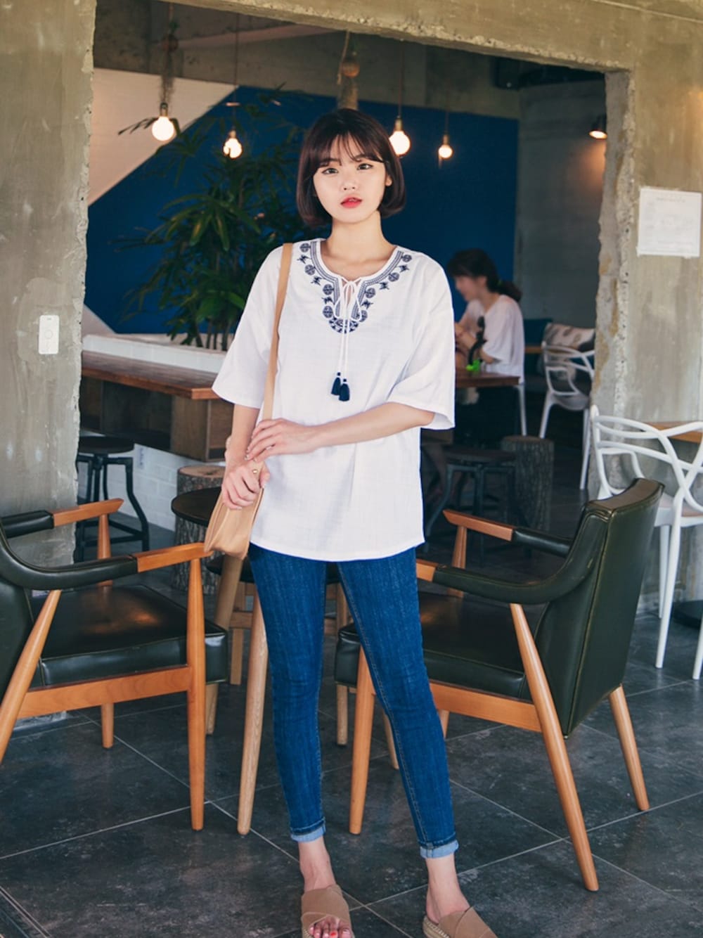 HOTPINGのシャツ/ブラウス「ネック刺繍タッセルブラウス」を使ったコーディネート