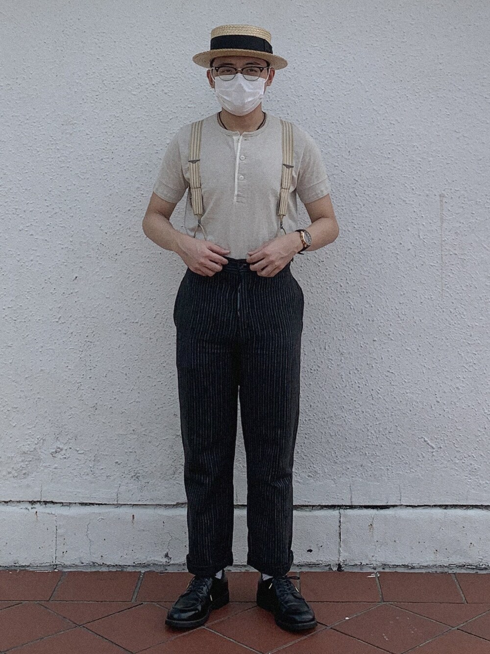 ブラウン系のメガネを着用したメンズの春コーディネートの1枚目の写真