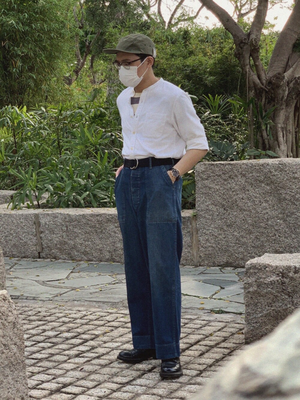 ブラウン系のメガネを着用したメンズの春コーディネートの1枚目の写真