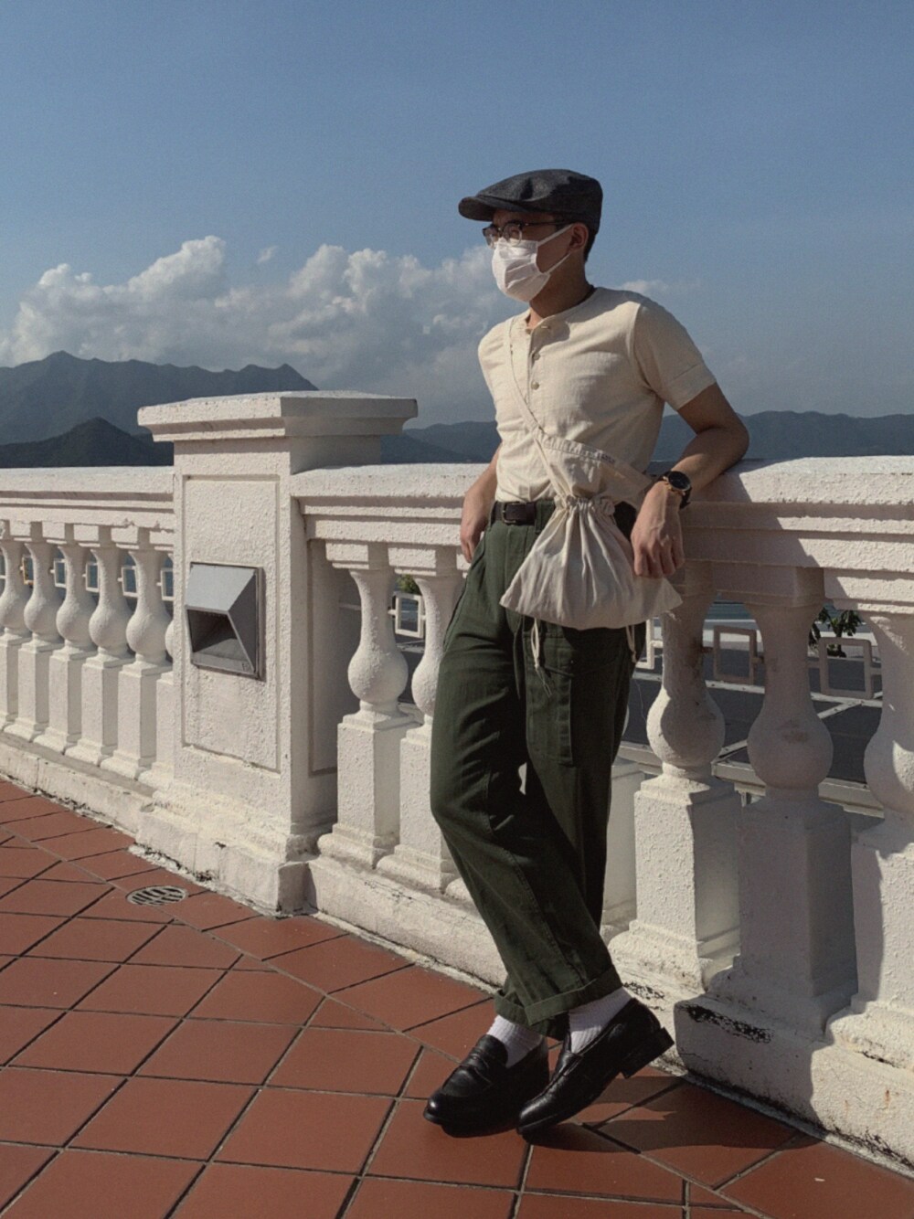 ブラウン系のメガネを着用したメンズの夏コーディネートの1枚目の写真