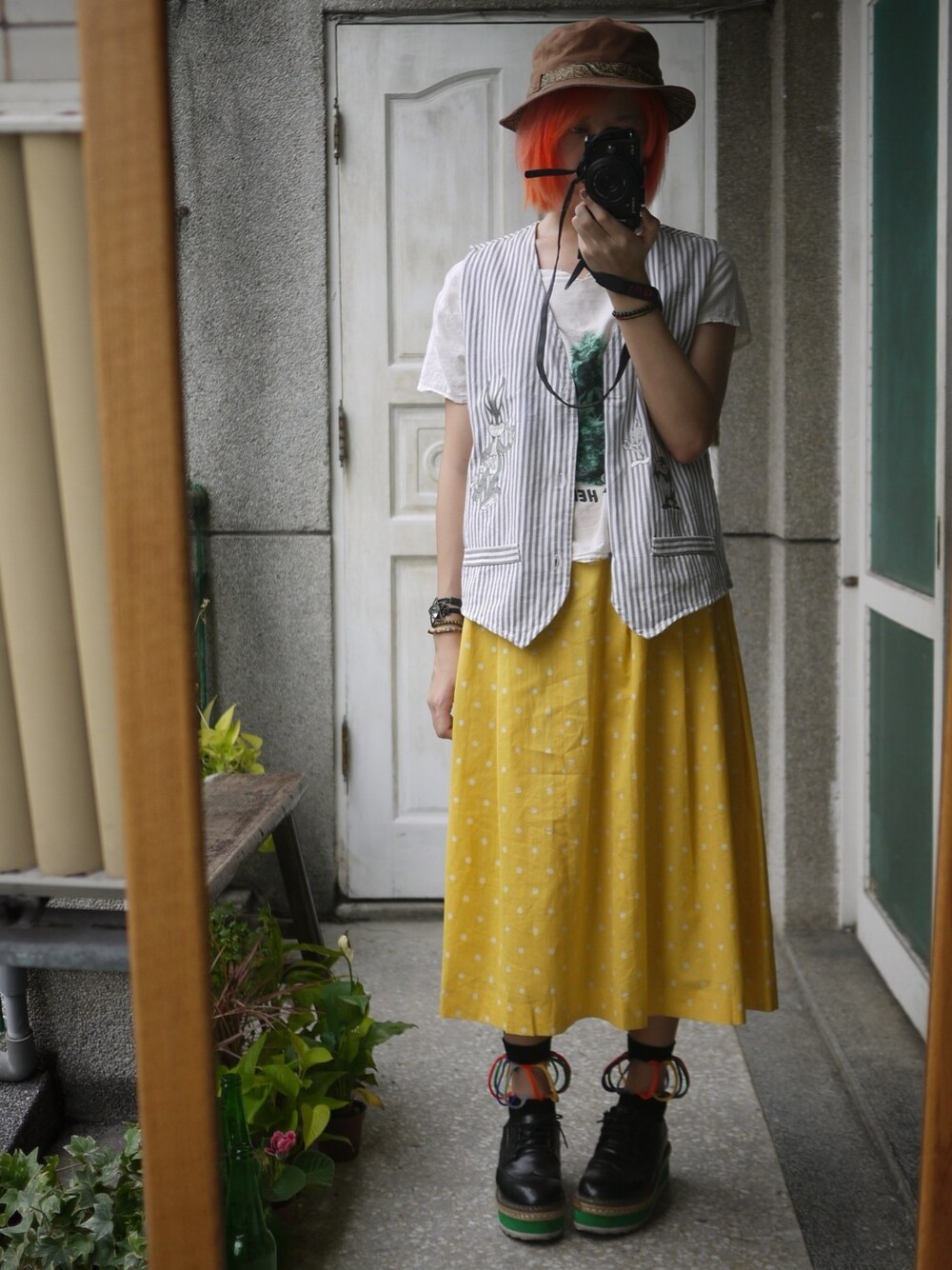 帽:古着 上衣:古着(購自sadon) 背心:古着(購自大阪) 裙:古着(購自paishop) 襪:購自paishop 鞋:購自sadonsirius 夏天的顏色,全身古着