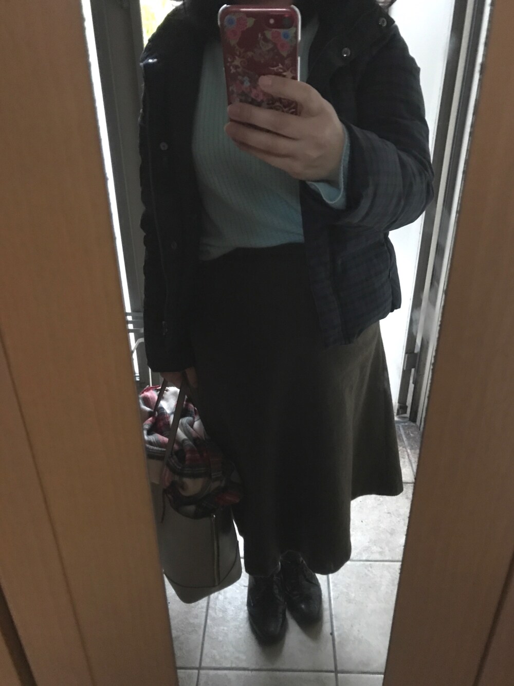 ブルー×グリーンの 寒色コーデ ☔️だけど 暖かいから嬉しい😊 SHARPARKのカシミアニット 薄くて明るくて暖かくて お気に入り❤️