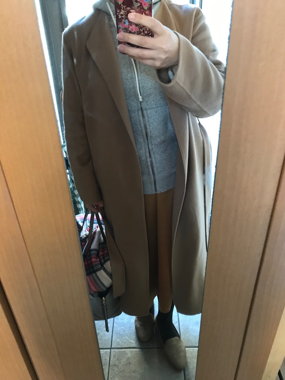 グレーパーカー×フレアスカート アウターはロングガウンコート PLSTのベージュのロングガウンコートは トレンチコートより厚手であったかく トレンチコートみたいに使える メリット発見👁 毎年この春先の寒暖差に悩むんですが 重宝するアイテムで良かった😄