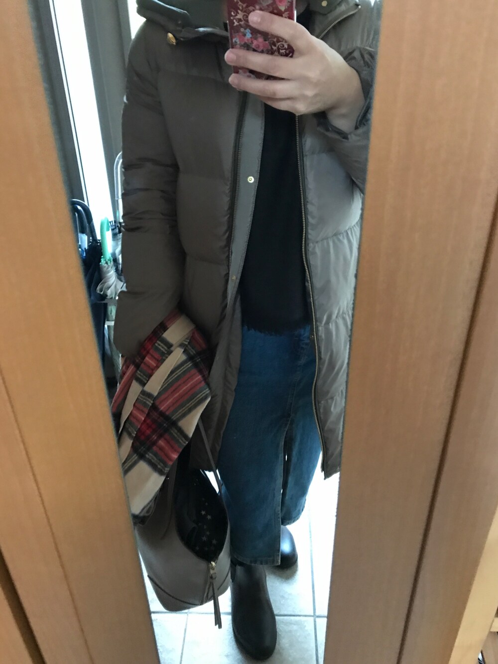 今朝は旗当番🚩 通学時間から☔️降ってた💧 雨対策コーデ ZARAのデニムスカートに セットアップのプルオーバー このダウンは きっと今日で今季最後のハズ❗️