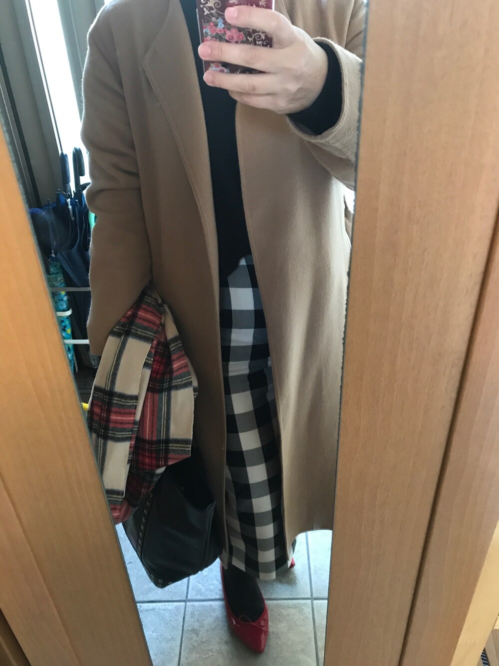 日中暖かくなるとはいえ 朝は冷えてました。 今朝は旗当番だったので ストールぐるぐるして正解🙆♂️ ベージュ×ブラック 赤を差し色🔴