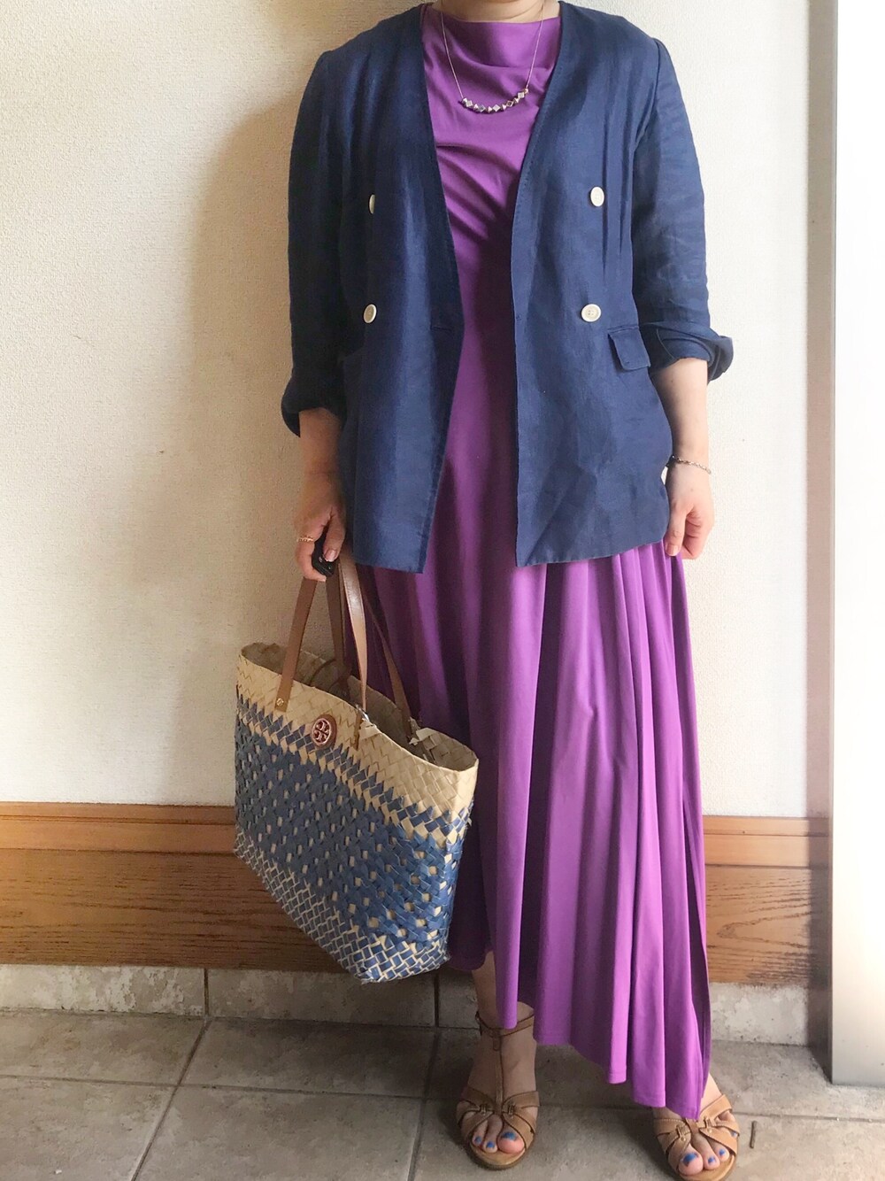 【 ワンピースを学校行事コーデ 】 朝イチに息子の高校の面談の日 ELENDEEK のタックワンピース ラインがきれいなのに ウォッシャブル✌️ アシンメトリーの裾デザインも ドキュン😍😍😍 学校行事コーデ には ジャケット で合わせたかったんです アラフィフママ コーデの完成✌️ 一見派手に見えると思いますが navy × purple × beige 3色で抑えてます💜 他のコーデもあります Instagram @hiroko_plus Web site https://happyplus.me