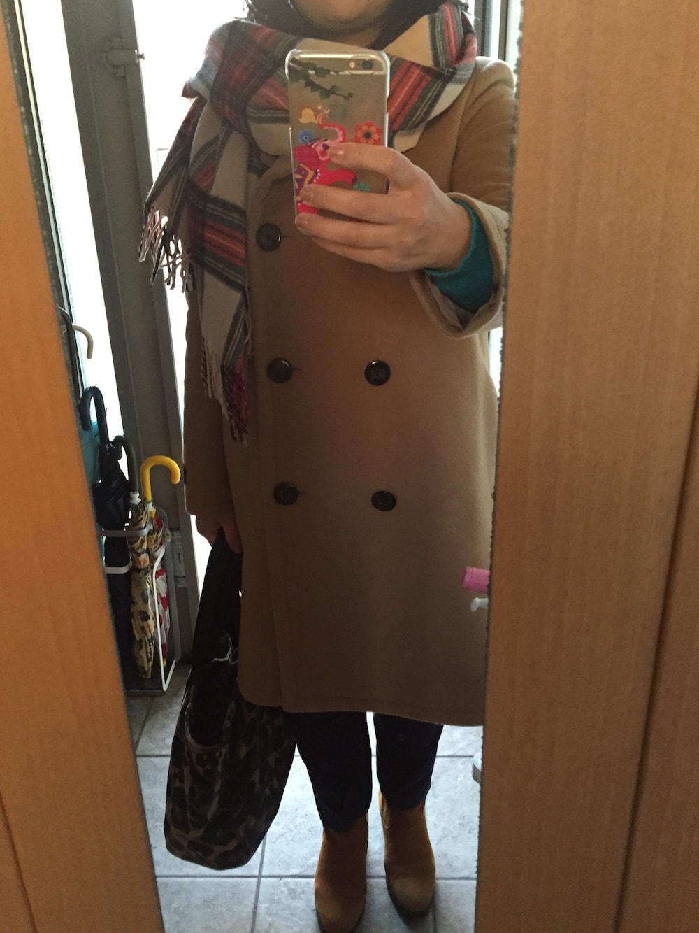 キャメルコートにチエックのストール合わせ。 さすがに今朝は冷え込んでますね❄️