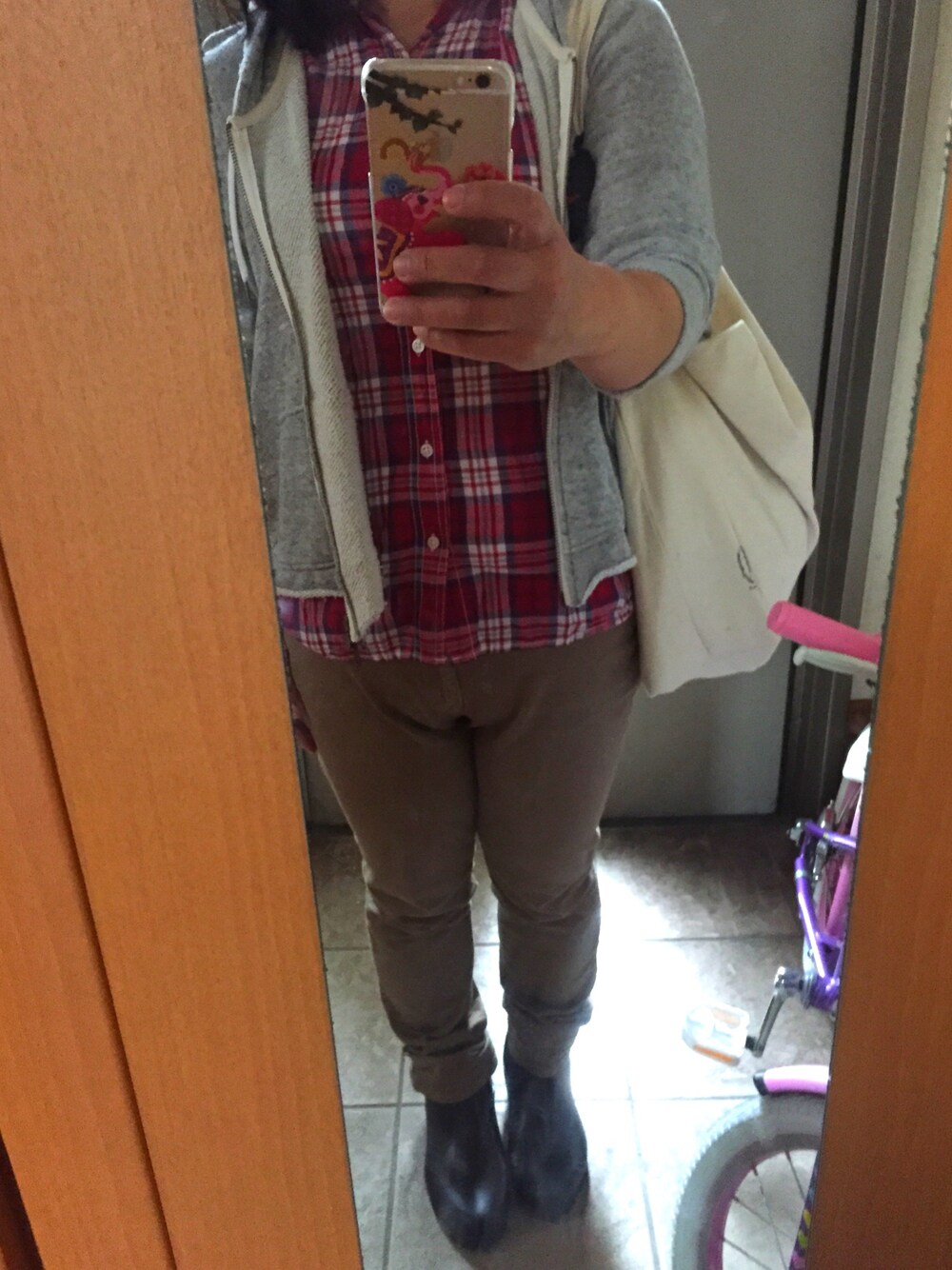 連休明けで気合いも入らず😅 おみやげの手荷物と、雨予報☔️でレインブーツ必須のため、どカジュアルに。 旅行用に買ったショルダーのエコバッグ 意外とお気に入り❤️