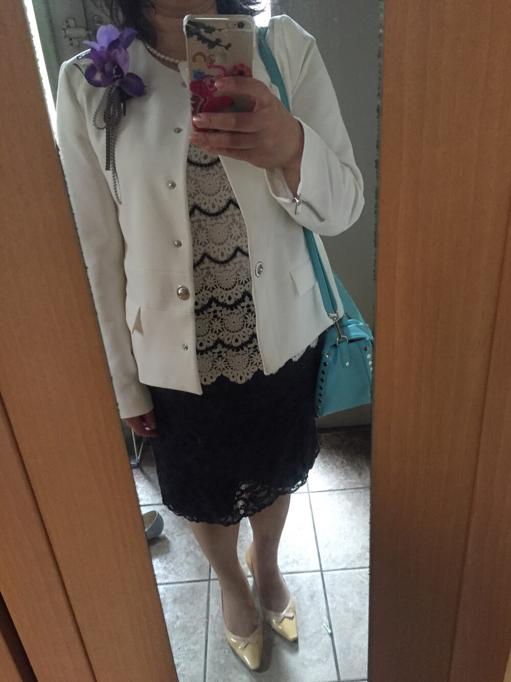 中学校入学式のフォーマルコーデ🌸 ☔️でした…(-。-; 悩んだけど 白ジャケット×レースの上下 ザネラートで華やかさをブラス 白ジャケットって入学式くらいにしか 着れないことに気がつきました😳
