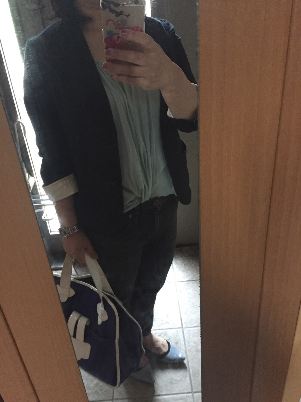 今朝は旗当番🚩 ジャケット着ていったけど冷んやり🌀 今日はペールトーングリーンに黒合わせ red cardのブラックデニム 履きやすーい😉