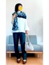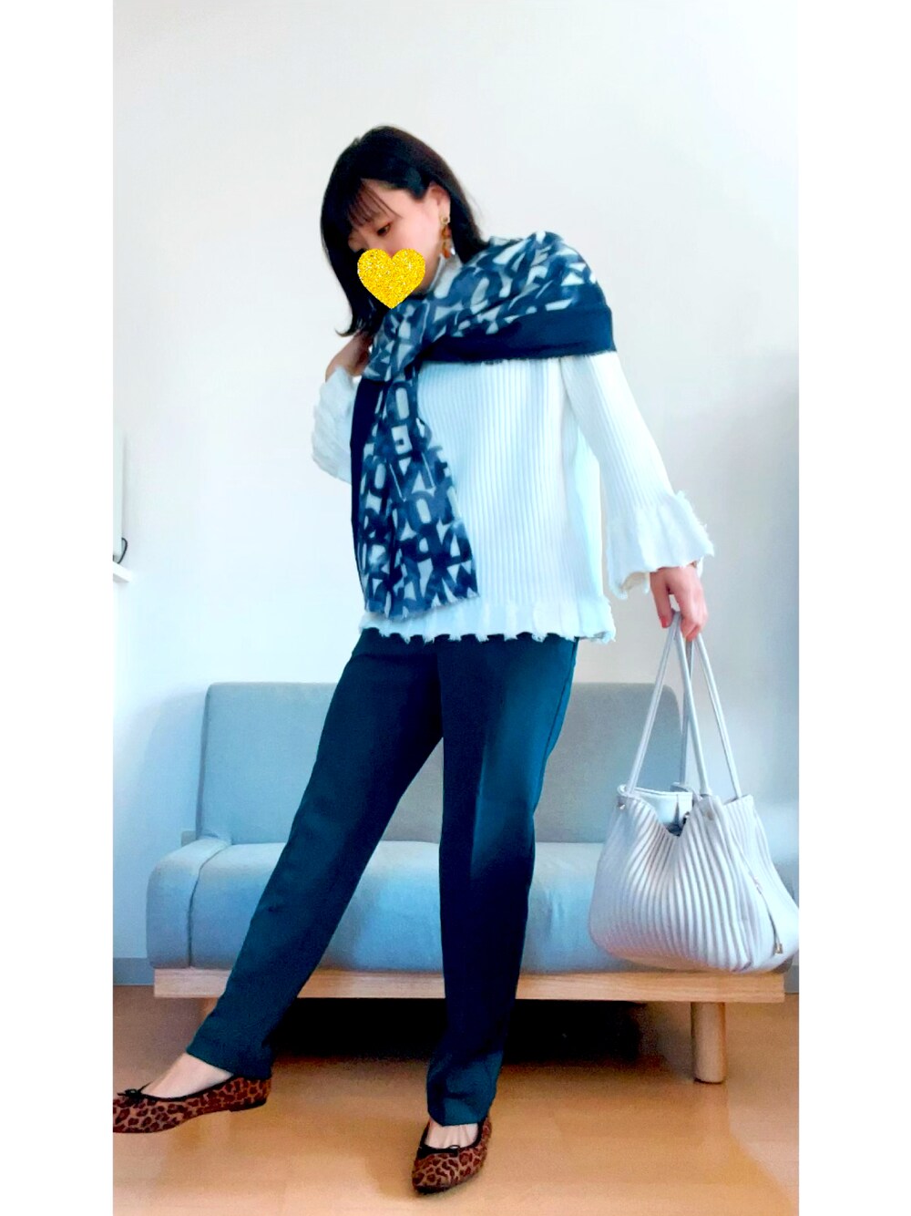 閲覧ありがとうございます🙇♀️ いいねくださる皆様もいつもありがとうございます🤲✨ 袖、裾フリンジの真っ白ニットにグリーンのセンタープレスパンツ合わせ🐻❄️🐸 お気に入りのモノグラム風ストールがポイント✨