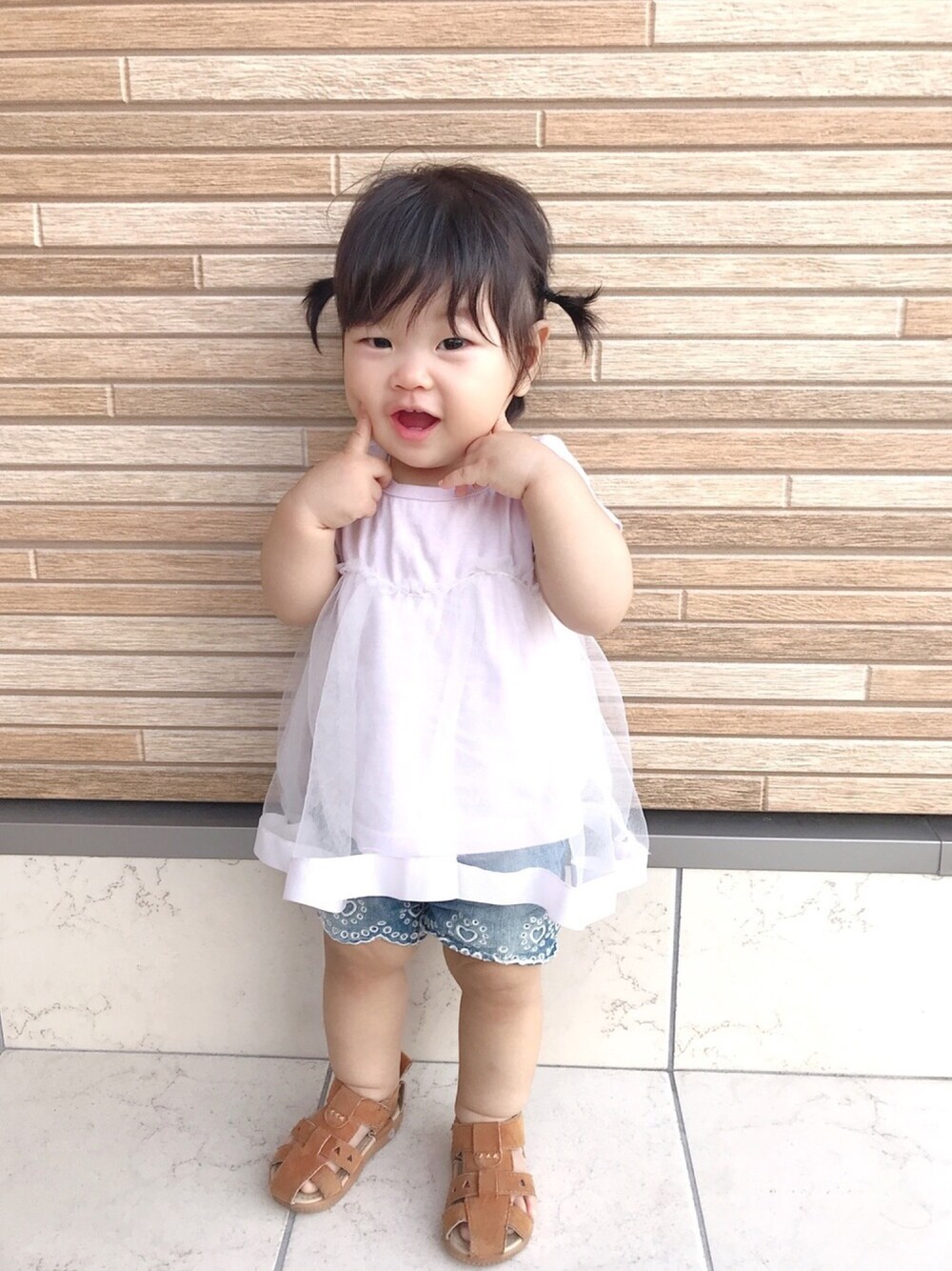 音ちゃんコーデ♡ 一歳になって お姉さんらしくなりました、 お友達にプレゼントしてもらった トップスがお気に入りです☺️☺️ サンダルと短パンは姪っ子のおさがりです