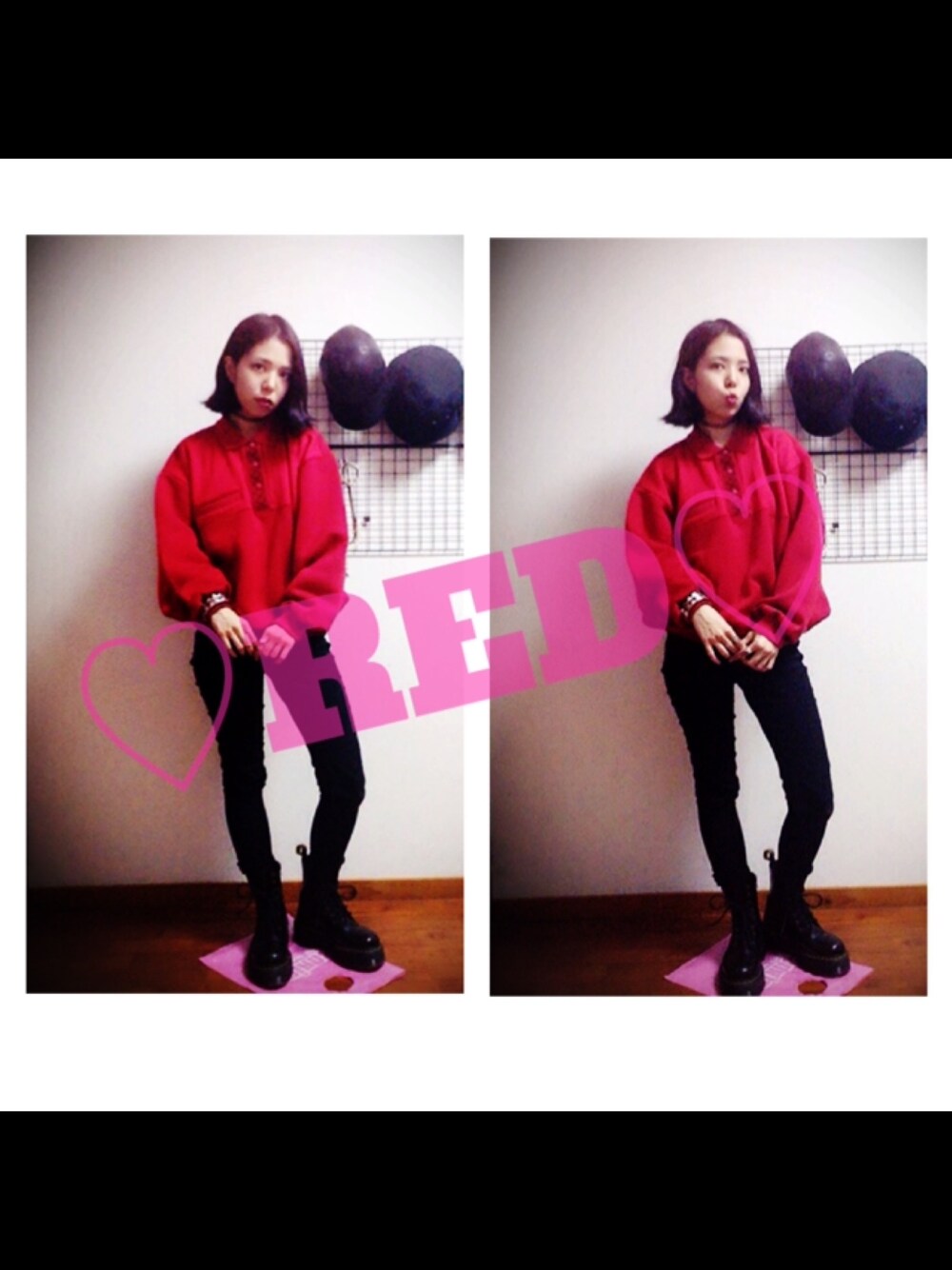 珍しく赤!!!赤赤赤!!! このトップスはセカンドストリートで¥300♡♡ 安いのにちょーー可愛くてちょーあったかい…☺️☺️ぬくぬく そして私事ですが髪きりました 笑 外ハネが似合う長さっ🙌 美容師さんと相談しながら切ったからめっちゃ楽しかったし満足☺️☺️ 色もくらーい紫入れてもらいましたん