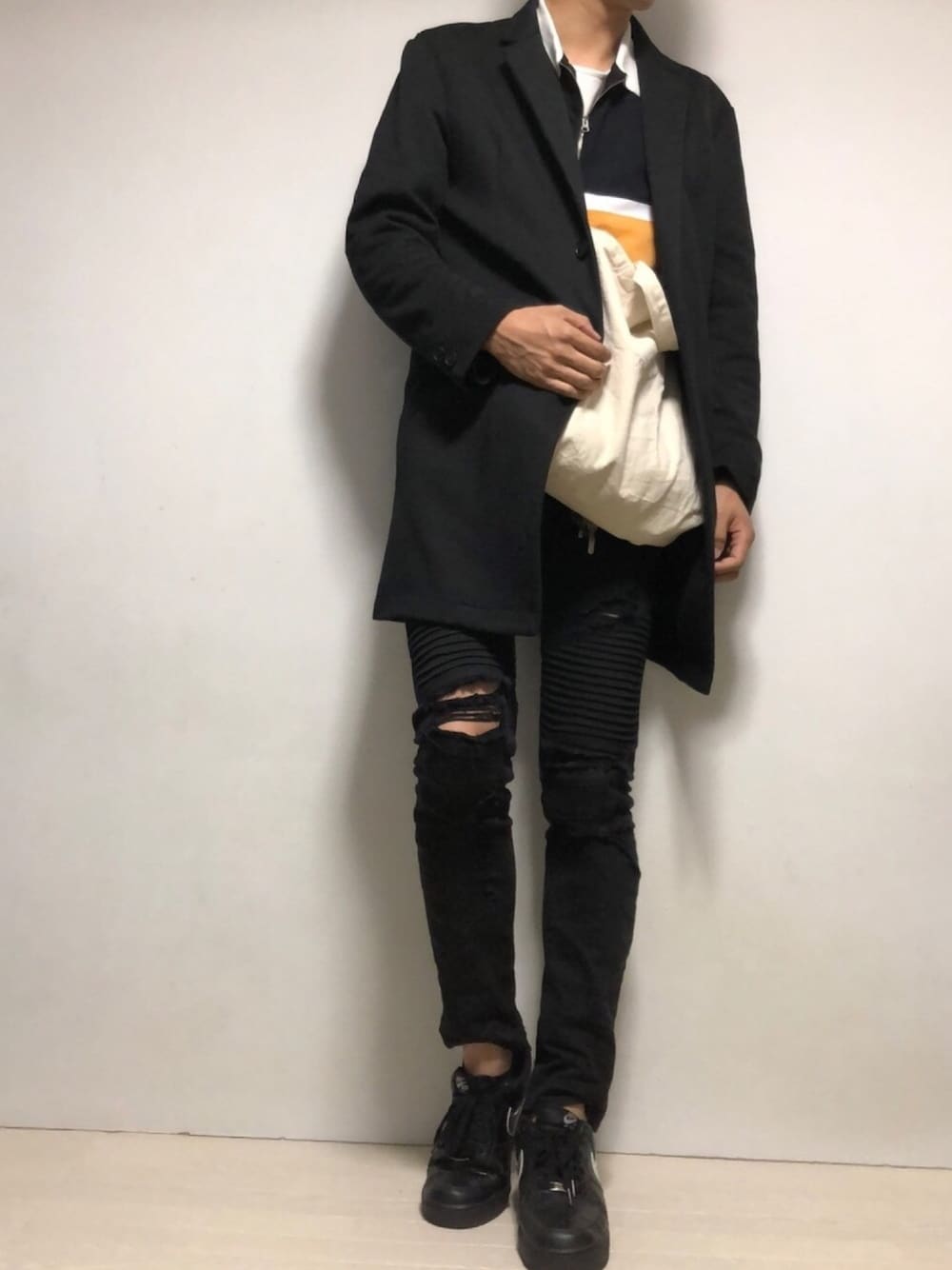 -コーデのポイント- ・黒でクールな雰囲気を出しつつ、トートや黄色の差し色で可愛さを出した ・クラッシュデニムで韓国ファッションを意識した 今日のオススメポイントは、スキニーに存在感のあるスニーカーを合わせること、です。細身のシルエットを見せつつ、スニーカーの存在感を際立たせることができます😊そう言った意味でも、ナイキのエアフォース1は紹介したいアイテムの1つです!ずっしりとしたつくりで、他のスニーカーと比べても、一際存在感のあるスニーカーだと思っています。 気になる方はぜひ、購入してみてください! #wearhalloween2018のタグ付けました!僕の中でのハロウィンのイメージは、暗い色の中に、華やかな色合いが煌めく、といったイメージだったので🎃