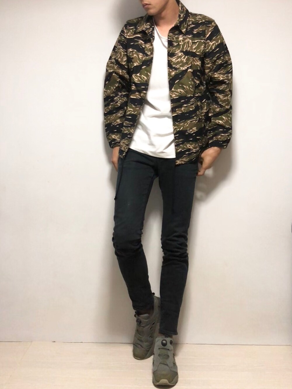 -コーデのポイント- ・総柄のコーチジャケットを軸にコーデを作った ・ミリタリー調でワイルドな印象を ・コーチジャケット×スキニーの抜群の相性 -今日のオススメ- 『GU スキニージーンズ ブラック』 ①脚へのフィット感が程よく、理想のシルエットが作れる ②飾りのないつくりなので、どんなコーデにも適用可能 ③価格が2500円とローコスト、ハイパフォーマンス ④前述の理由から、ブラックのみならず、複数購入もあり ちなみに、僕はGUのスキニージーンズは今日紹介しているブラックに加えて、ブルー、濃紺の3種類持っています!価格面から、高校生から社会人まで手の出るアイテムだと思うので、気になる方はぜひGUまで足を運んでみてください!