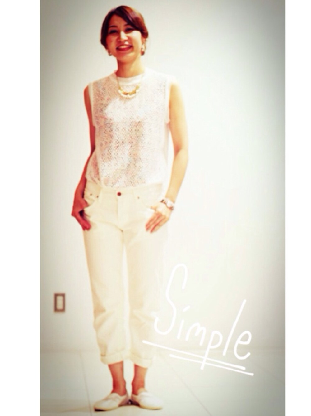 第3回clamp collection☆ 7月テーマ Men's『白×緑×ミリタリー×アクセサリー』 Lady's『白×カラースキニー×アート柄×ビックアクセ』 トップス:ZARA パンツ:ジャーナルスタンダード