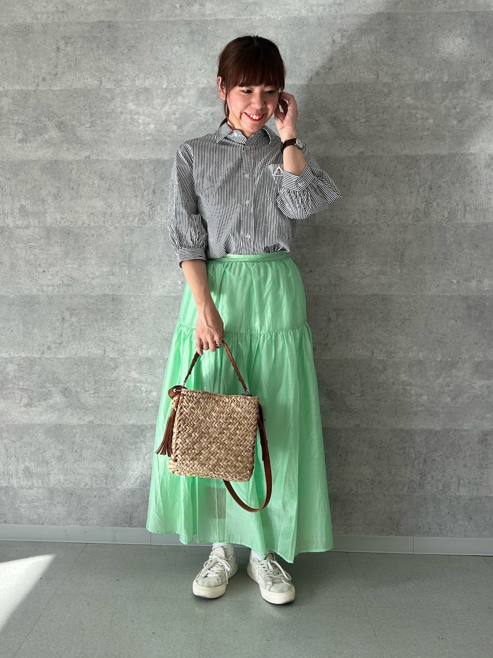 シアーギャザースカートを使った初夏コーデ* GEVACOタイプライター6分袖シャツはサラッとしてるので夏も使えて万能です* 中もTシャツが着れるくらいのサイズ感なので着回しもいろいろして頂けそうです◎